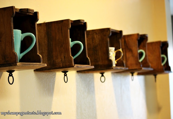 Cajones de un mueble/escritorio colgados en en la pared como estantes para tus tazas o lo que quieras.